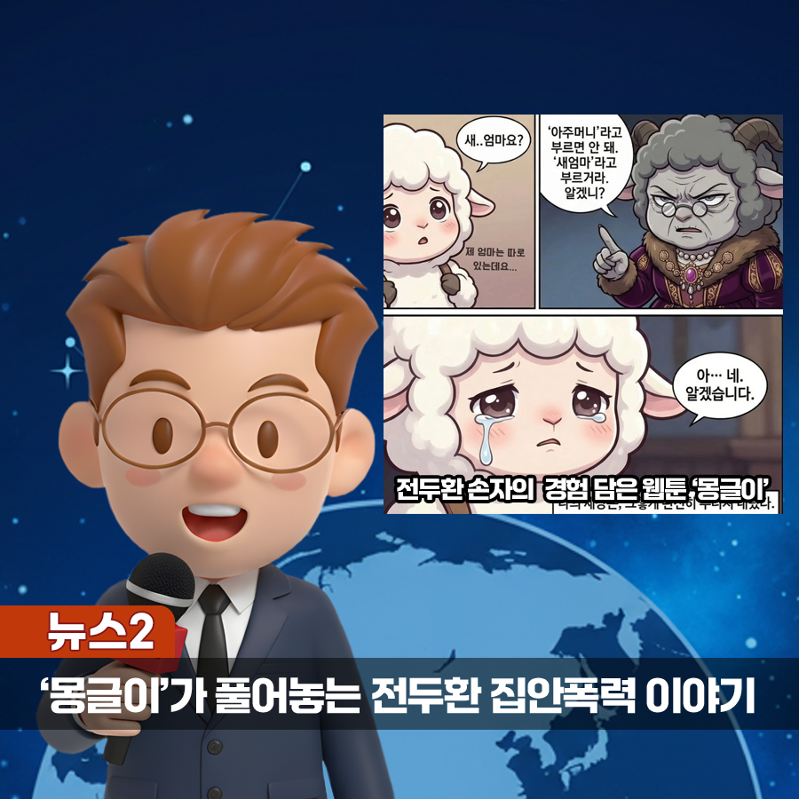 두 번째 뉴스는 전두환 손자의 웹툰 ‘몽글이’로 보는 집안 폭력 이야기 관련 소식이고,