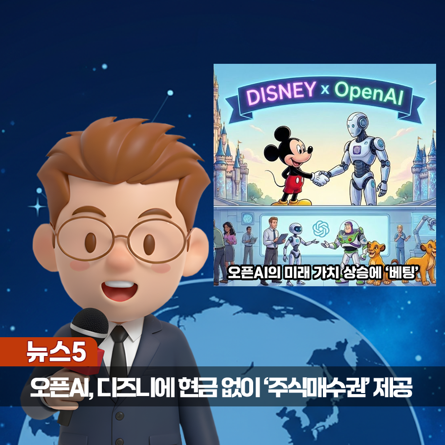 다섯 번째 뉴스는 오픈AI, 디즈니 캐릭터 사용료 전액 ‘주식매수권’ 지급 관련 소식 등 입니다.